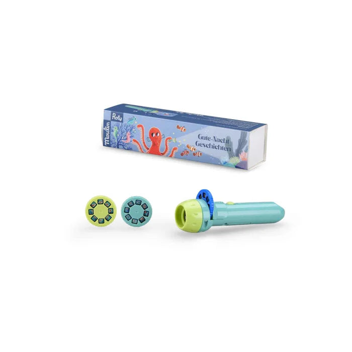 Willkommen in den Tiefen des Ozeans mit Paulie, dem Oktopus, und ihren Freunden! Enthält einen Taschenlampenprojektor und 3 Scheiben, um wunderbare Geschichten zum Schlafengehen zu erfinden. Mach das Licht aus, damit die Magie geschieht, und los geht's...