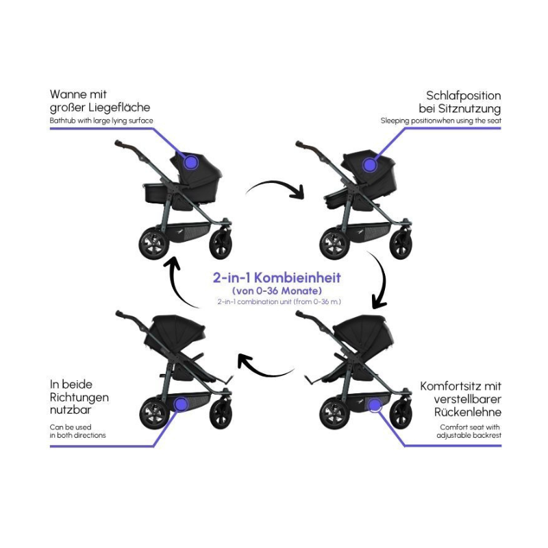 Das Herzstück des mono3 ist die patentierte Kombieinheit, die Babywanne und Sportsitz in einem vereint. Sie wächst von Geburt an mit, lässt sich mit wenigen Handgriffen umbauen und kann jederzeit in oder gegen die Fahrtrichtung angebracht werden. So bleibt ihr immer flexibel – Nähe in den ersten Monaten, freie Sicht auf die Welt, sobald der Entdeckergeist erwacht.